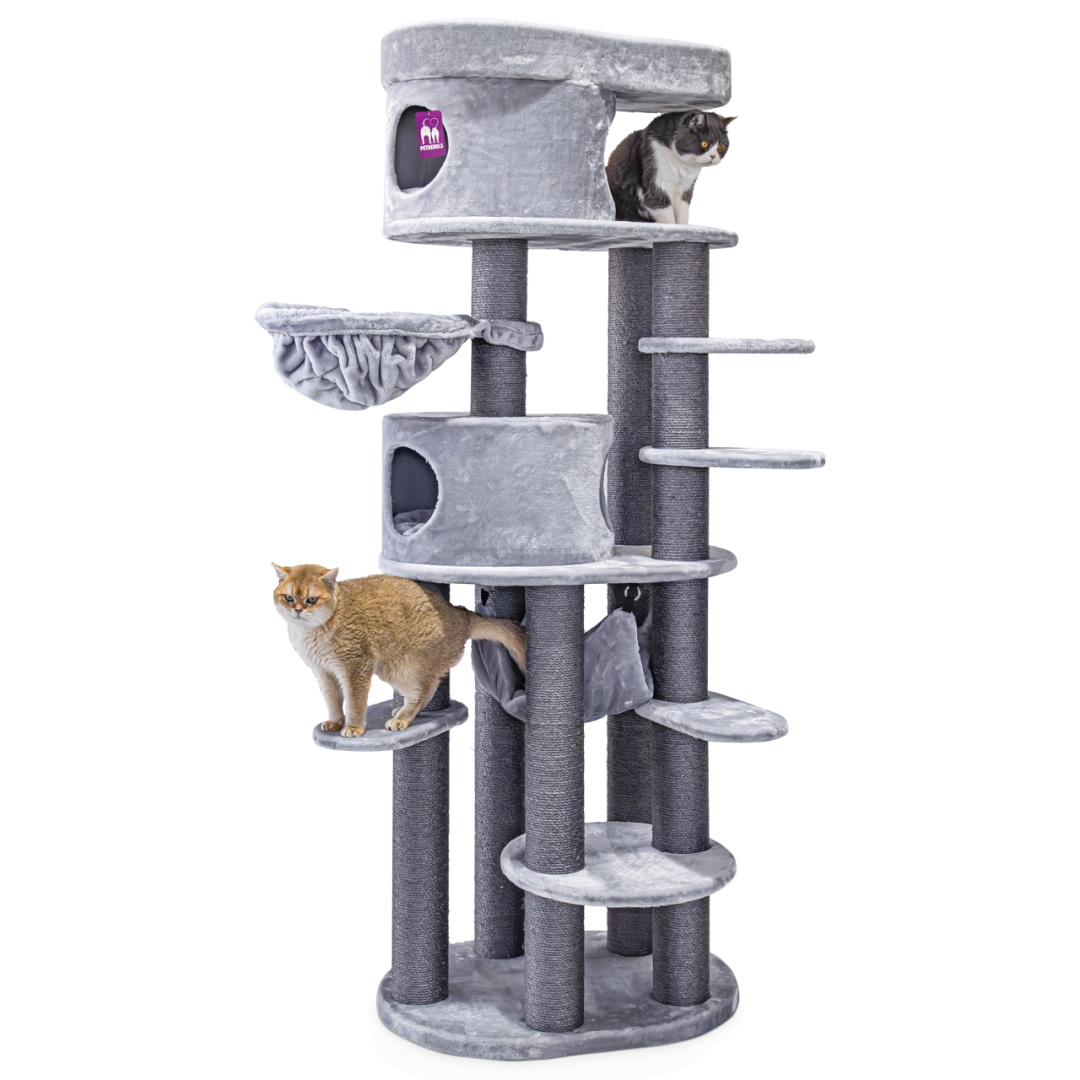 Het Petrebels Kings & Queens krabmeubel Isabella 210 is hoger, luxer en nóg uitgebreider. Met maar liefst twee knusse slaaphuisjes, een grote hangmat, meerdere plateaus én een XXL loungemand bovenin is dit een paradijs voor klimmers, dromers en speelkampioenen. En dankzij de extra dikke pluche voelt alles heerlijk zacht aan. De stevige bodemplaat en extra hoge krabstammen zorgen voor maximale stabiliteit én lekker veel krabplezier. Ideaal voor alle soorten katten, ook voor senioren, kleintjes of bangepoeperds die het fijn vinden om alles en iedereen vanaf grote hoogte in de gaten te houden.