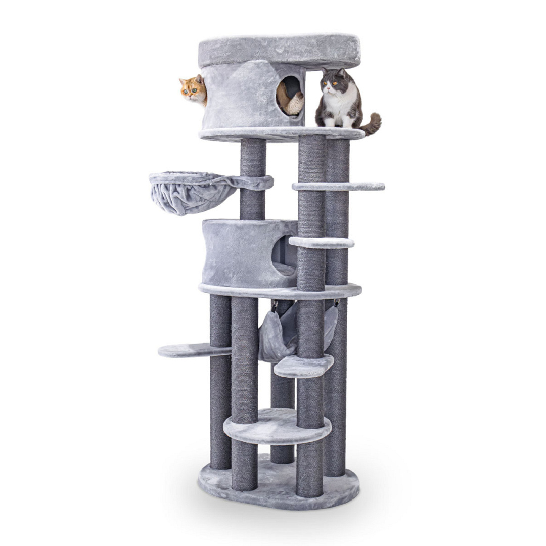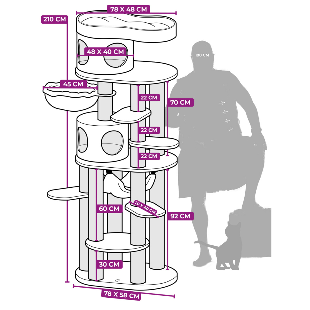 Luxe extra hoog krabmeubel met twee knusse slaaphuisjes, een grote hangmat, meerdere plateaus én een XXL loungemand bovenin. Afm. 78 x 58 x 210 cm.