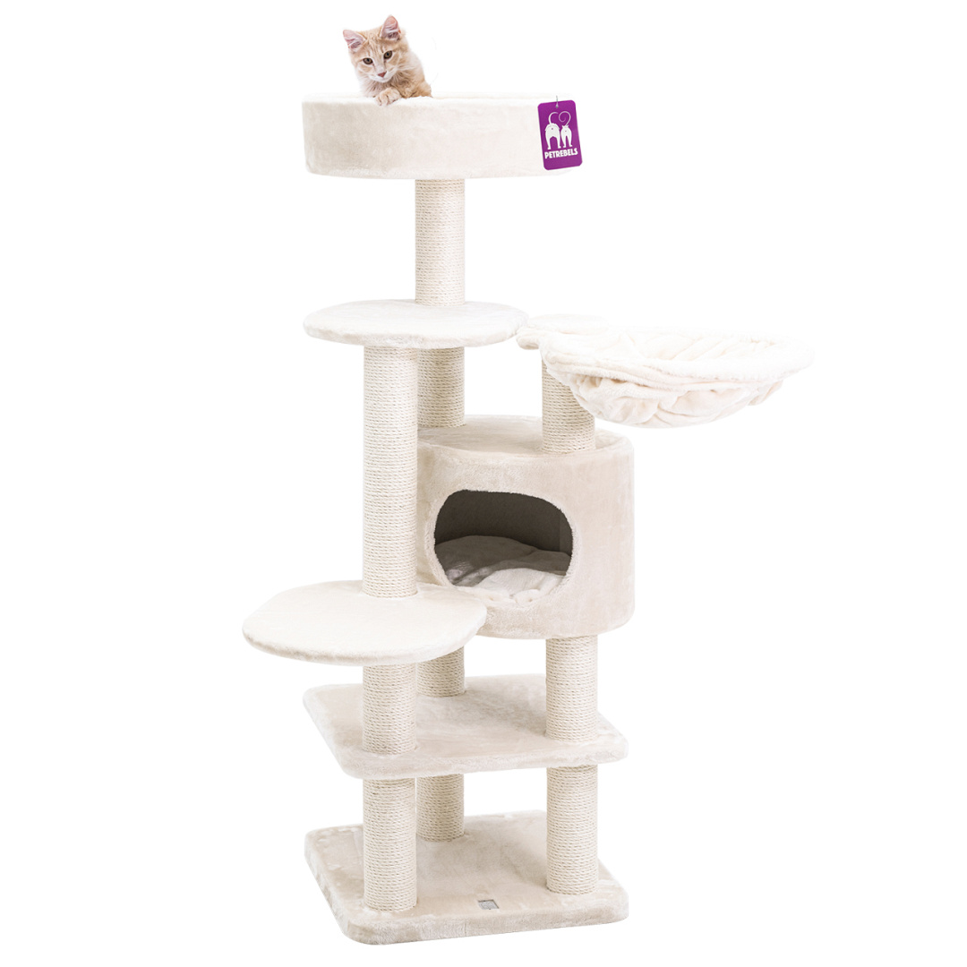 Fijn kattenmeubel met een zacht slaapholletje, een heerlijke hangmat en een extra grote loungemand bovenin. Afm. 50 x 50 x 138 cm.