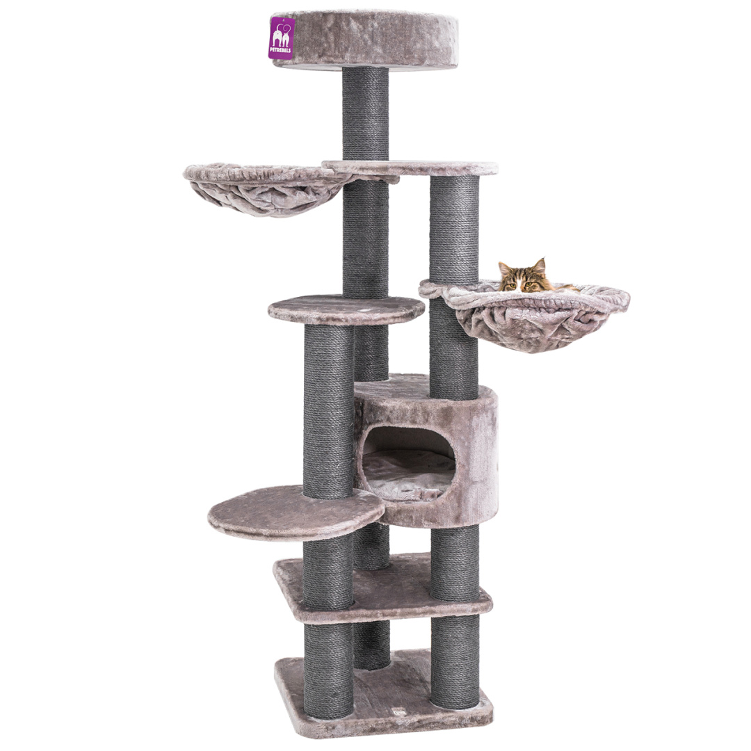 Petrebels Krabmeubel Kings & Queens Jane 175 is speciaal voor grote katten en kattenrassen. Die hebben namelijk behoefte aan sterke en hoge krabstammen om aan te krabben en zich uit te strekken. Want daar worden ze blij van. Maar er is meer! Twee superzachte hangmatten, een fijn slaaphuisje en een grote zachte loungemand bovenop. Plek zat dus voor meerdere katten. En door de extra dikke bodemplaat is deze topper superstabiel.