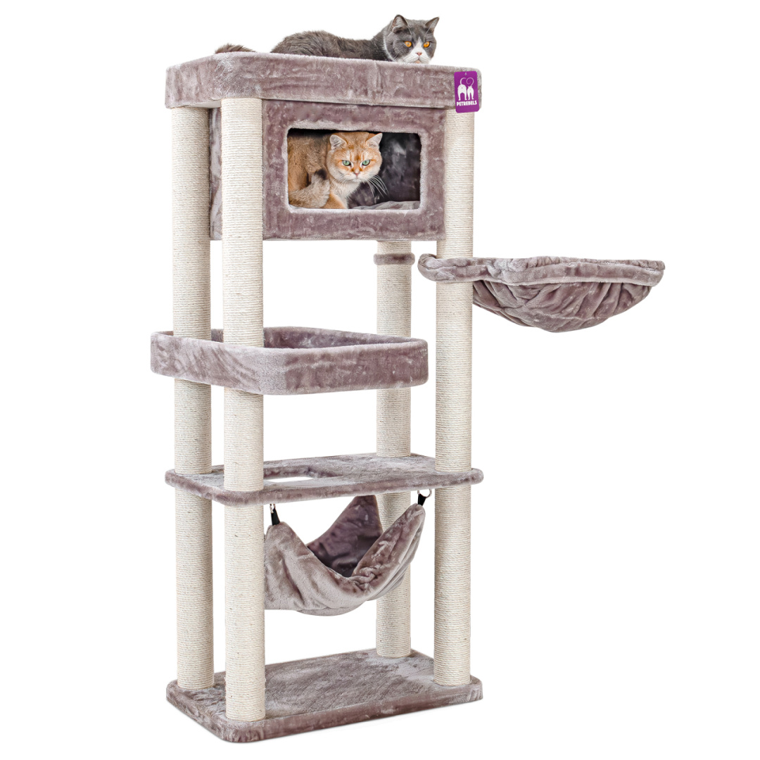Het Petrebels Sweet Petite krabmeubel Mansion 150 is een krabpaal die je niet snel over het hoofd ziet. Want strak design in combinatie met verrassend veel comfort, dat wil toch elke kat? De rechte lijnen maken hem stoer terwijl het zachte pluche en het slimme ontwerp voor pure luxe zorgen. Deze krabpaal heeft het allemaal: een royale hangmat onderin, een fijn slaaphuisje, een speels kruipgat in het eerste plateau en een XXL-loungemand bovenin om te chillen. Deze krabpaal is compact en dus ook heel geschikt voor wat kleinere kamers. Maar laat je niet foppen door z’n formaat, hier passen met gemak meerdere katten op!
