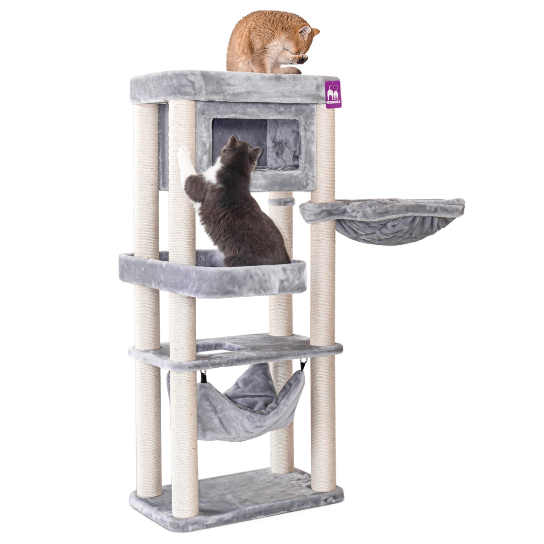 Het Petrebels Sweet Petite krabmeubel Mansion 150 is een krabpaal die je niet snel over het hoofd ziet. Want strak design in combinatie met verrassend veel comfort, dat wil toch elke kat? De rechte lijnen maken hem stoer terwijl het zachte pluche en het slimme ontwerp voor pure luxe zorgen. Deze krabpaal heeft het allemaal: een royale hangmat onderin, een fijn slaaphuisje, een speels kruipgat in het eerste plateau en een XXL-loungemand bovenin om te chillen. Deze krabpaal is compact en dus ook heel geschikt voor wat kleinere kamers. Maar laat je niet foppen door z’n formaat, hier passen met gemak meerdere katten op!
