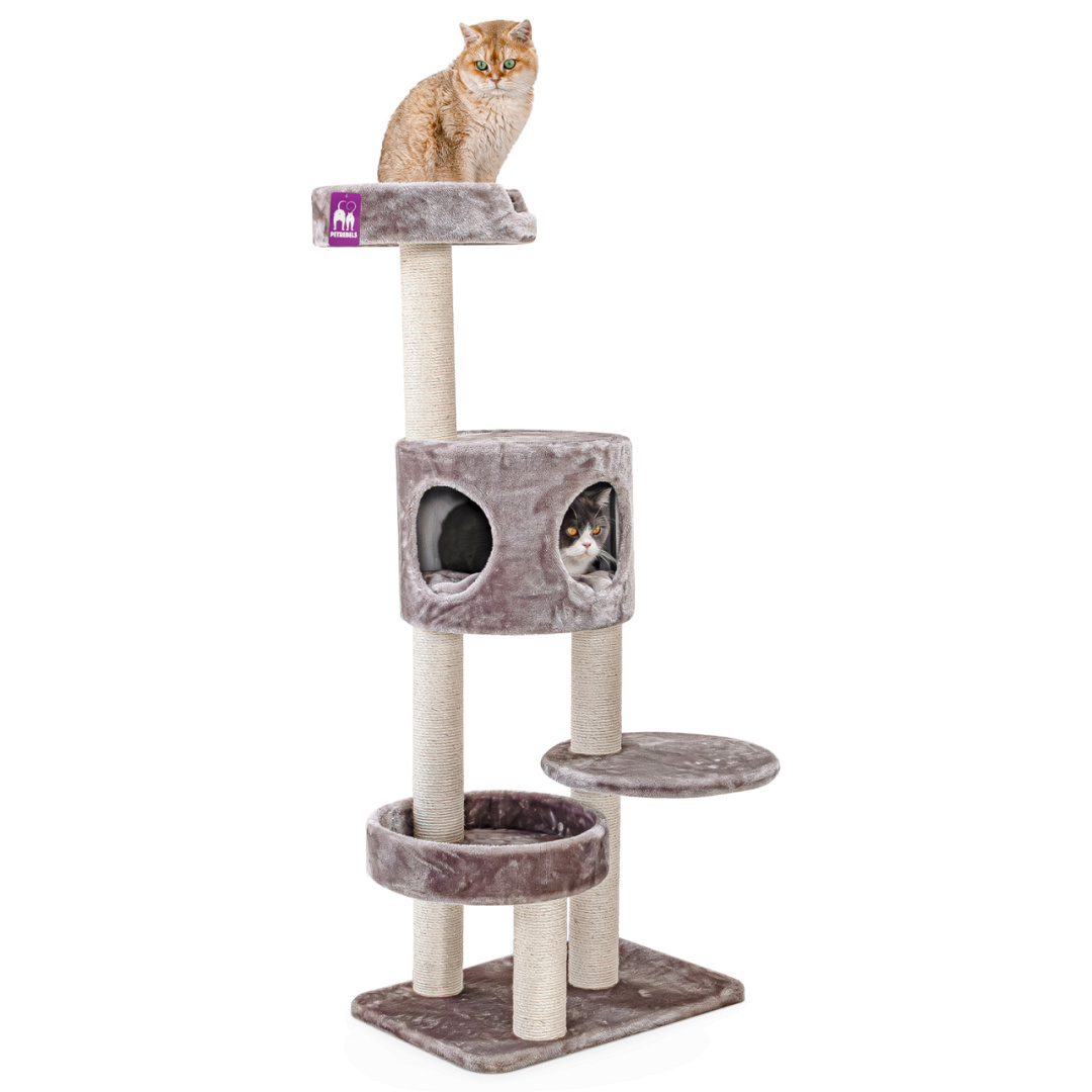 Krabmeubel met een ronde mand om in te relaxen, een stevig klimplateau, een royaal slaaphuisje en bovenin een zachte uitkijkplek. Afm. 60 x 40 x 142 cm.