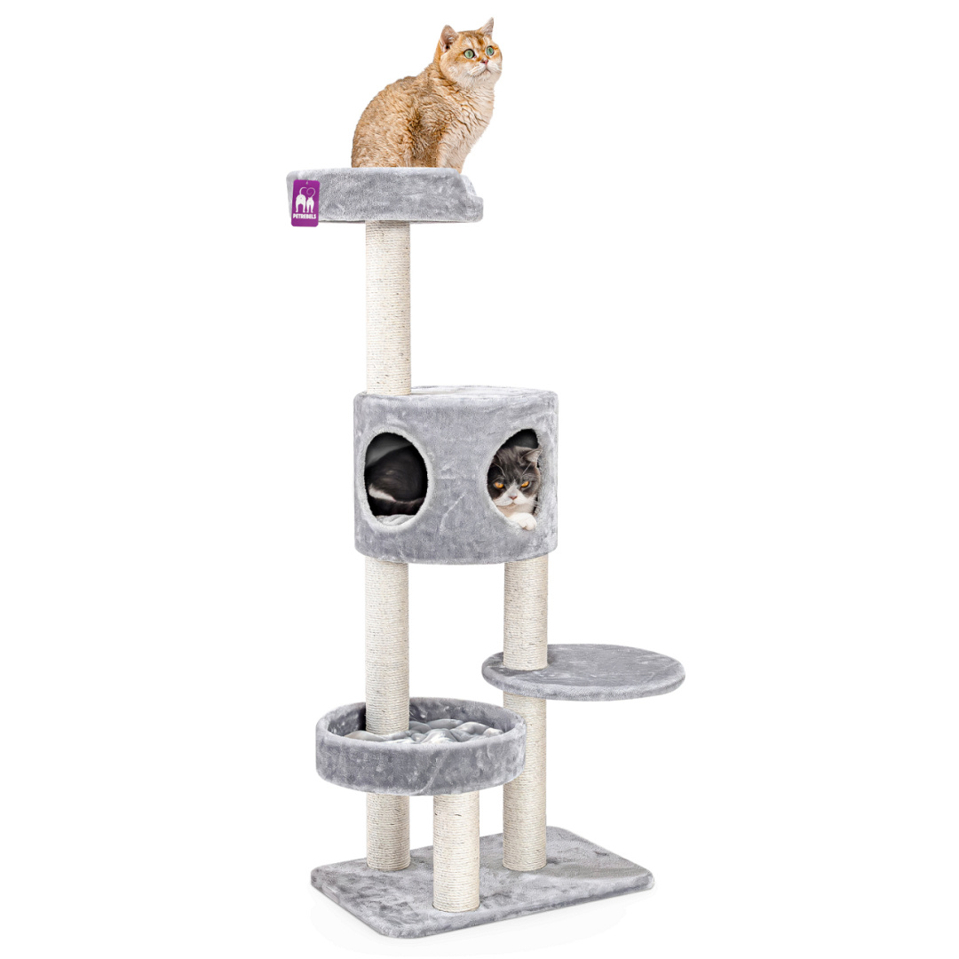 Krabmeubel met een ronde mand om in te relaxen, een stevig klimplateau, een royaal slaaphuisje en bovenin een zachte uitkijkplek. Afm. 60 x 40 x 142 cm.