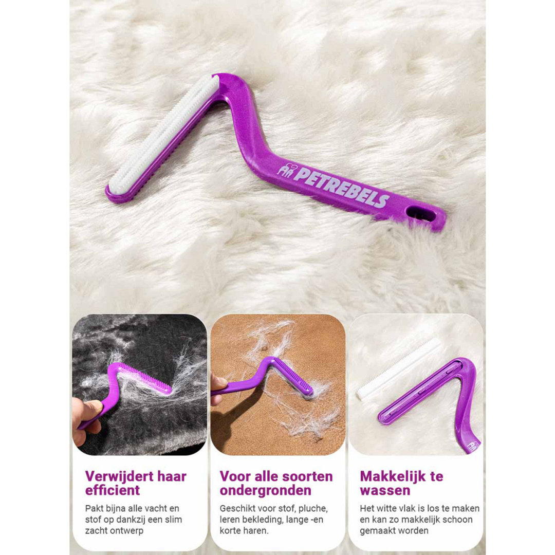 De Petrebels & More Hair Remover Lucky No. 7 is een unieke borstel waarmee je moeiteloos alle kattenharen verwijdert van je krabpaal, ligmand, trap, bank of bed. Dit compacte 7-vormige model is aan beide zijden te gebruiken. De korte paarse kant is geschikt voor fijne stoffen zoals stoffen of leren bekleding en de witte rubberen kant is geschikt voor onder andere pluche of grovere langpolige stoffen. Het witte oppervlak kan worden verwijderd om het schoonmaken te vergemakkelijken.