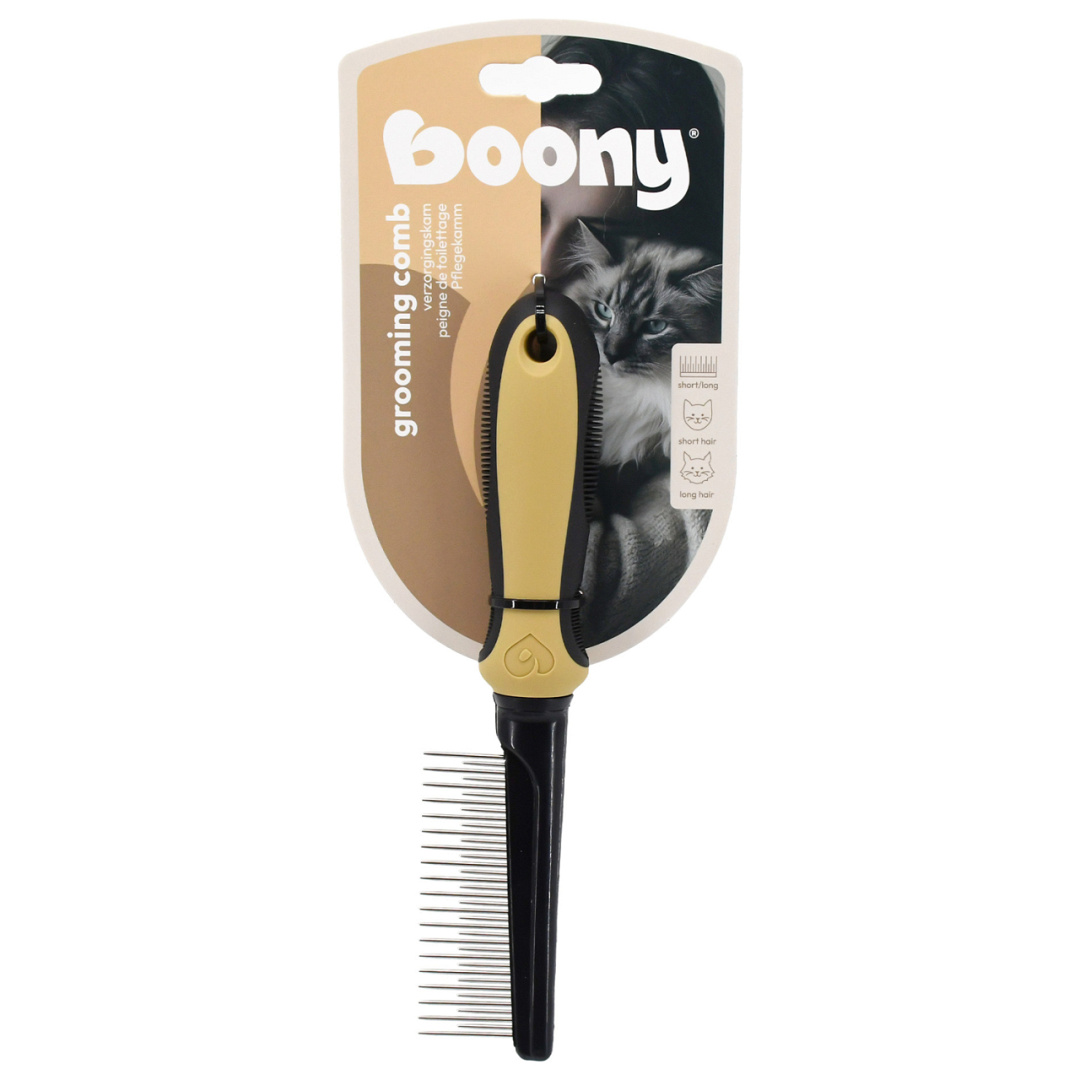 Deze Boony Verzorgingskam is speciaal ontwikkeld voor katten met zowel een onder- als bovenvacht. De kam maakt de vacht voorzichtig los en verwijdert effectief losse haren, vuil en beginnende klitten, zodat de vacht schoon, gezond en klitvrij blijft.