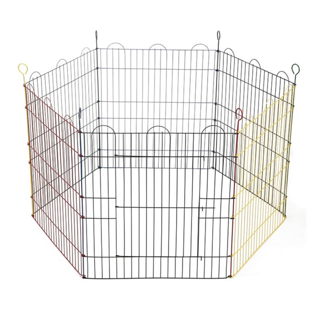 Gekleurde knaagdierenren met 6 panelen van 60 cm hoog voor in de tuin. Diameter 105 cm.