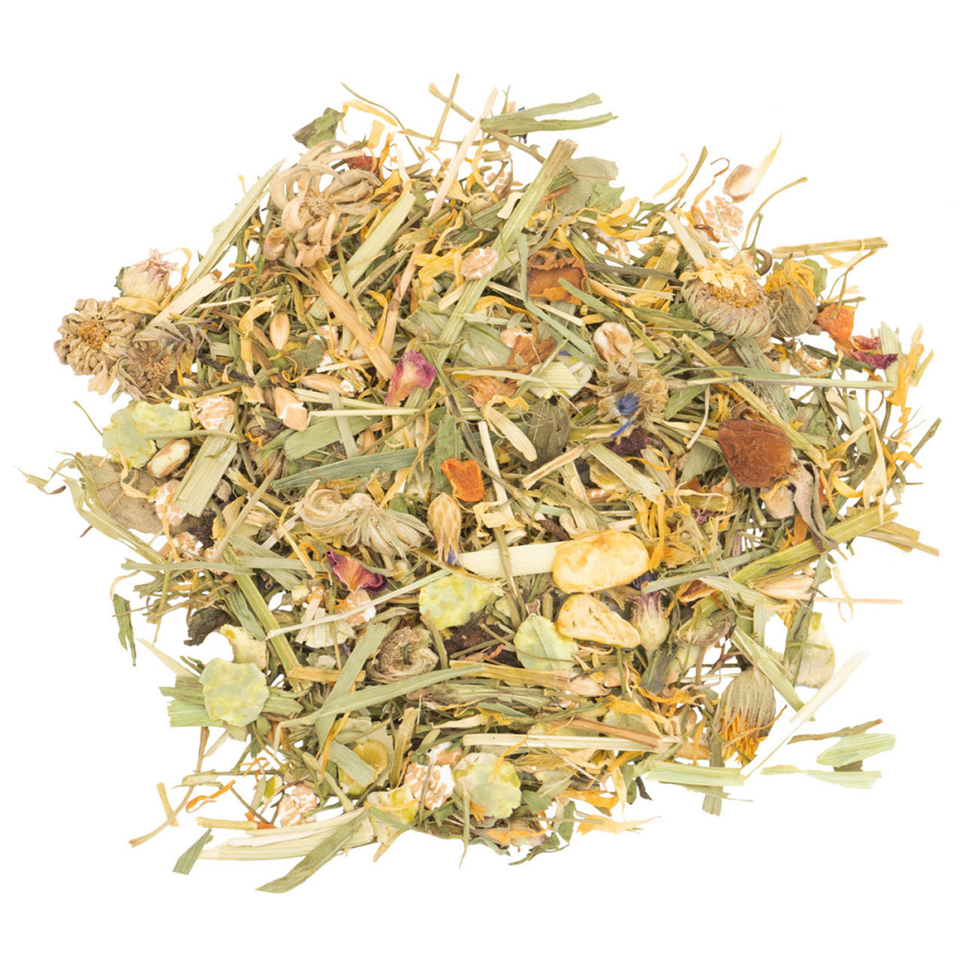 JR Farm Kruidenveld is een echte traktatie met knapperige vlokken van haver, tarwe en maïs voor een stevige basis, en bergweidehooi boordevol ruwe vezels ter ondersteuning van de spijsvertering. Peterselie, berkenblad en brandnetel werken vochtafdrijvend en helpen het lichaam zuiveren, terwijl paardenbloem en munt het metabolisme stimuleren en winderigheid tegengaan. De toevoeging van goudsbloemblaadjes kalmeert de huid van binnenuit, terwijl rozenblaadjes zorgen voor een subtiele geurbeleving. En met wortelstukjes vol beta-caroteen, ijzerrijke rode biet en erwtenvlokken boordevol plantaardige eiwitten draagt deze mix bij aan vitaliteit en welzijn van jouw kleine vriend. Een voedzame verwennerij voor elke dag!