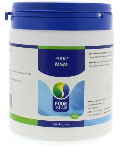 Puur MSM Paard & Pony ondersteunt de pezen en draagt bij aan een gezond bindweefsel en soepele gewrichten bij pony's en paarden. MSM (Methylsulfonylmethaan) is een organisch gebonden zwavel, welke goed opneembaar is door het lichaam. Het supplement kan door het voer gegeven worden. Bevochtig het poeder zodat het niet uit de voerbak geblazen wordt.