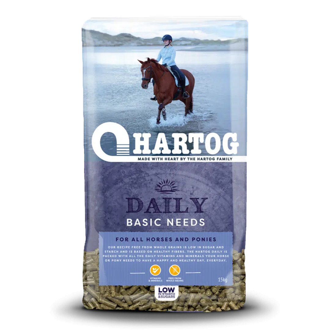 Hartog Daily is 60% lager in suiker zetmeel dan andere basisbrokken voor paarden en pony's. Dit komt doordat het recept vrij is van hele granen zodat de brok zo breed mogelijk in te zetten is. Dankzij het lage suiker- en zetmeelgehalte is de Hartog Daily zeer geschikt voor verschillende typen paarden en pony's: van recreatie tot lichte sport. Bevat alle dagelijks benodigde vitaminen en mineralen naast het ruwvoerrantsoen.
