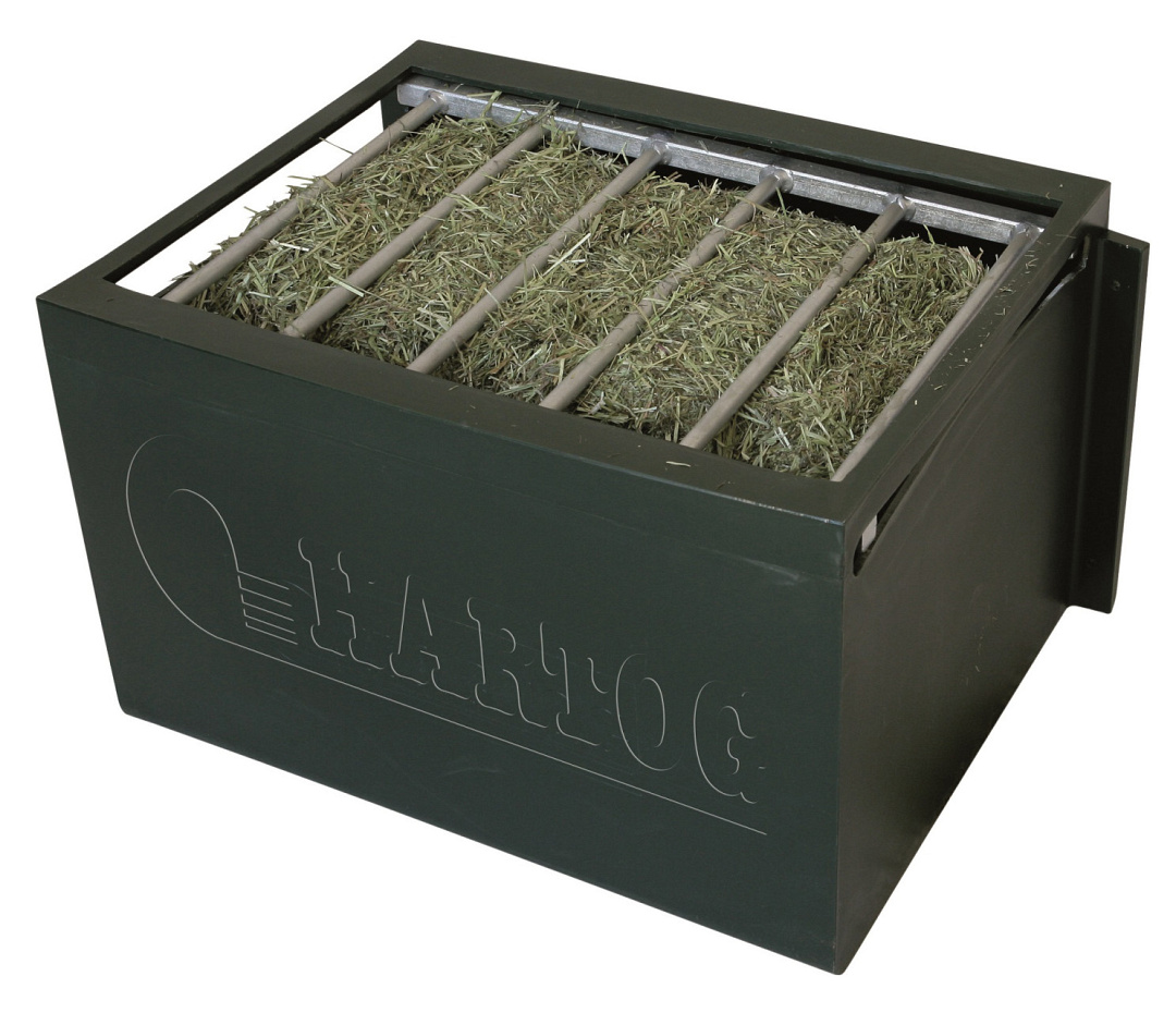 De Voerbox XL is uitgevoerd met een metalen rek dat constant op het voer rust, waardoor een langzame opname van het ruwvoer wordt gecreëerd. Een paard kan geen grote happen tegelijk nemen, waardoor ca. 1 kg Compact Gras per uur opgenomen kan worden. Het grazen in de weide wordt zo in de stal nagebootst. De Voerbox XL beschikt over een morsrand, zodat geen voedselverlies optreedt. De Voerbox XL kan gevuld worden met een hele baal Hartog Compact Gras. Het paard kan de hele dag eten, waardoor een natuurlijke situatie optreedt en gedrags- en verteringsstoornissen worden voorkomen.