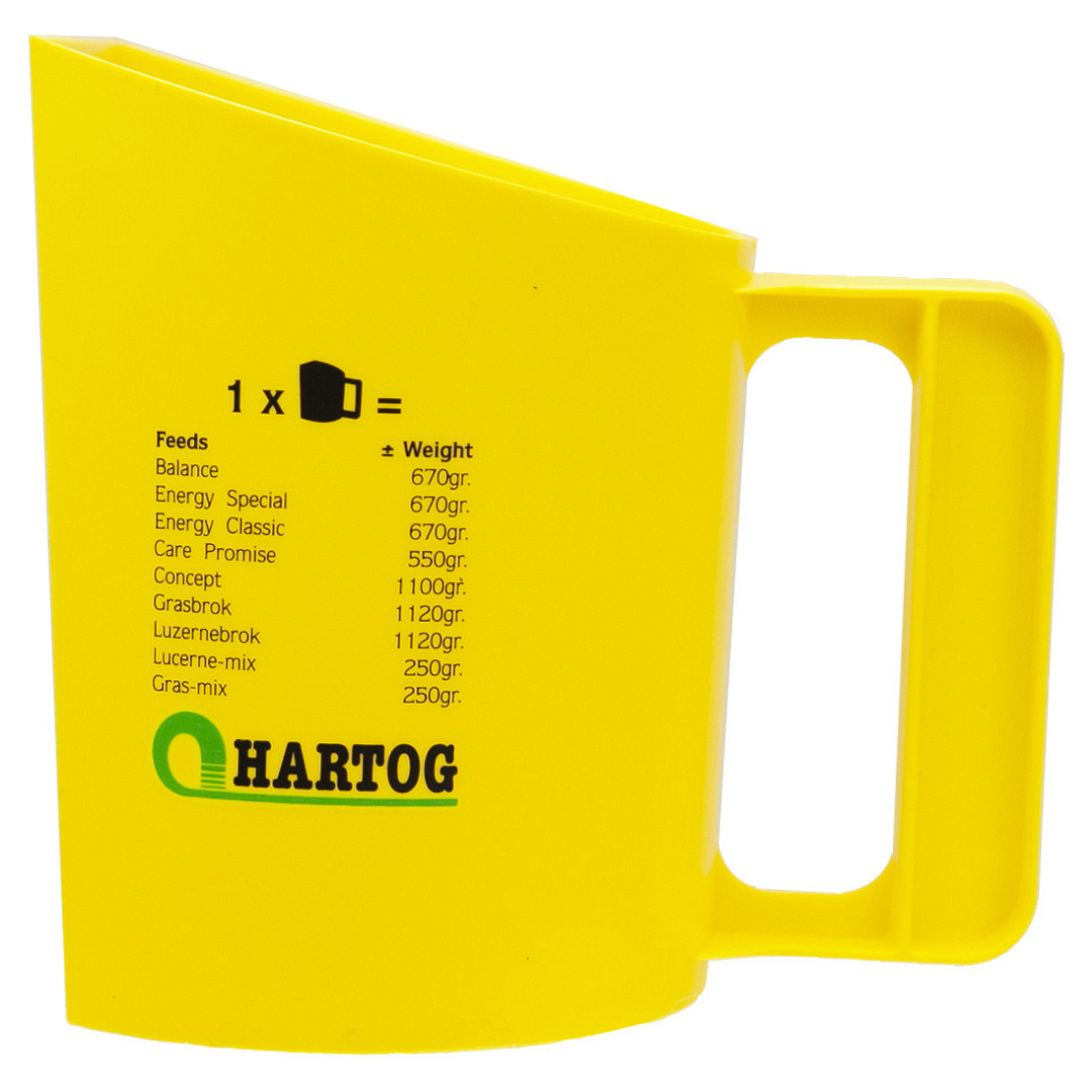 Doordat het gewicht in een volle Hartog voerschep afhankelijk is van het product dat er gevoerd wordt is er aan de zijkant te vinden hoeveel een volle voerschep weegt bij elk Hartog product. Zo is een volle voerschep Lucerne-mix 250 gram en Grasbrok 1120 gram.